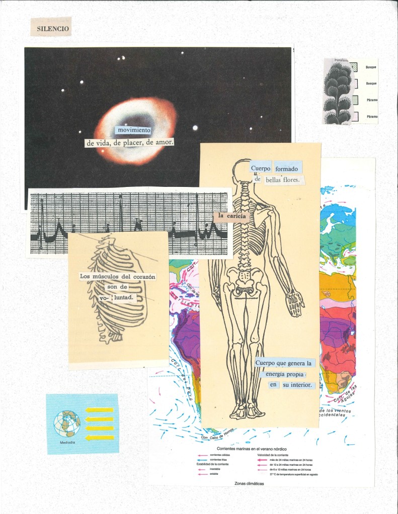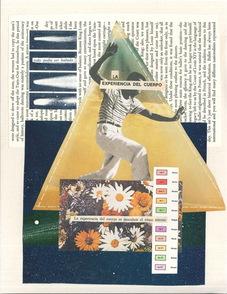 Espacio de creación que surge de la exploración de la técnica de collage cómo herramienta para expresar diversos sentires alrededor del oficio de la danza. Las composiciones centran su atención en el cuerpo, en las reflexiones que surgen de su sabiduría, de los cuestionamientos políticos, íntimos y sentimentales que emergen de pensarse el cuerpo y el movimiento cómo un lugar de saber.
